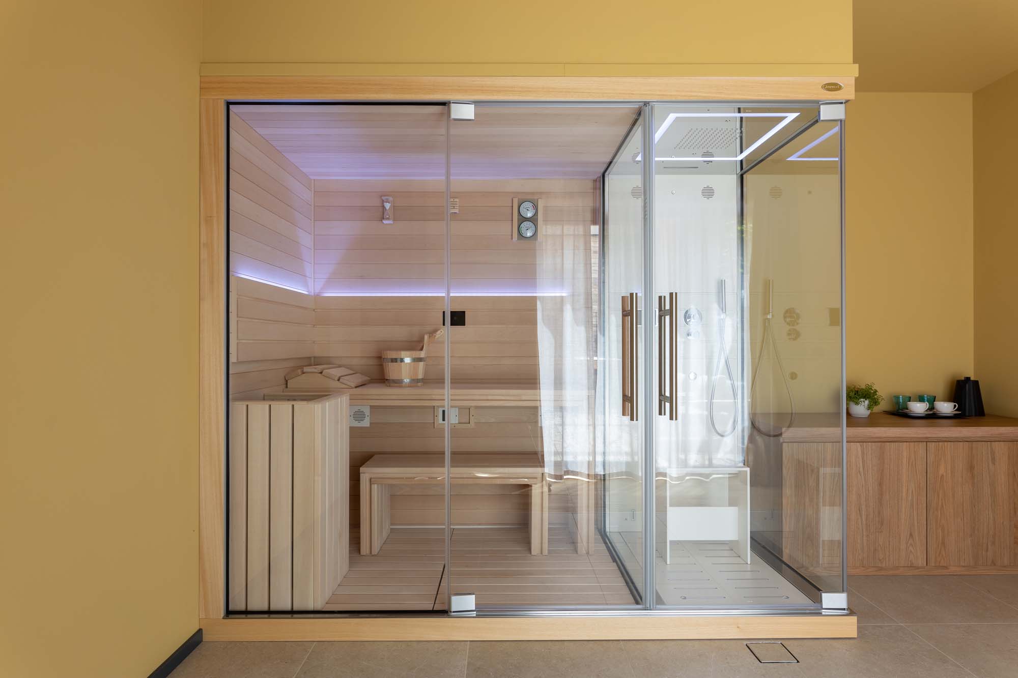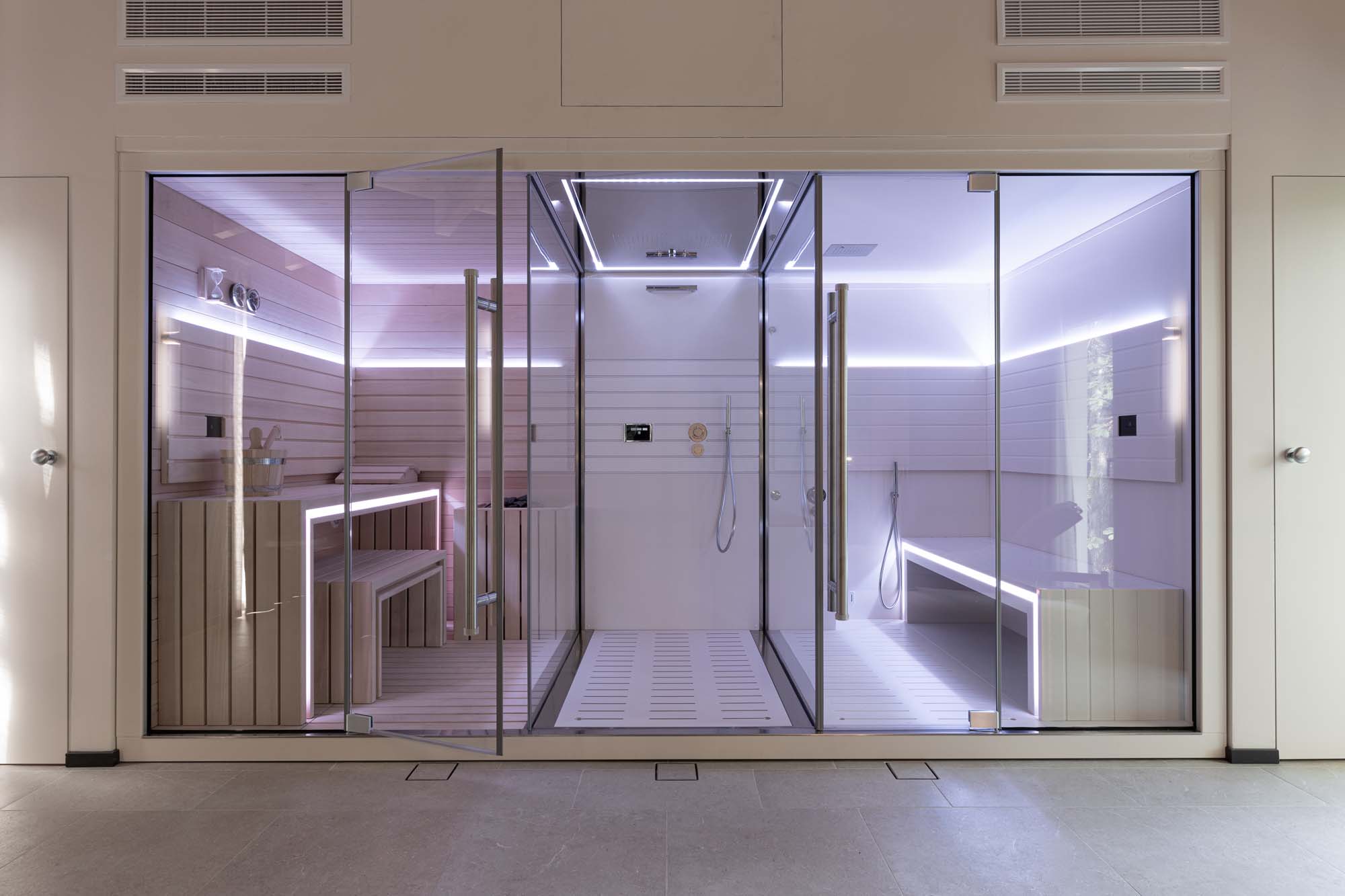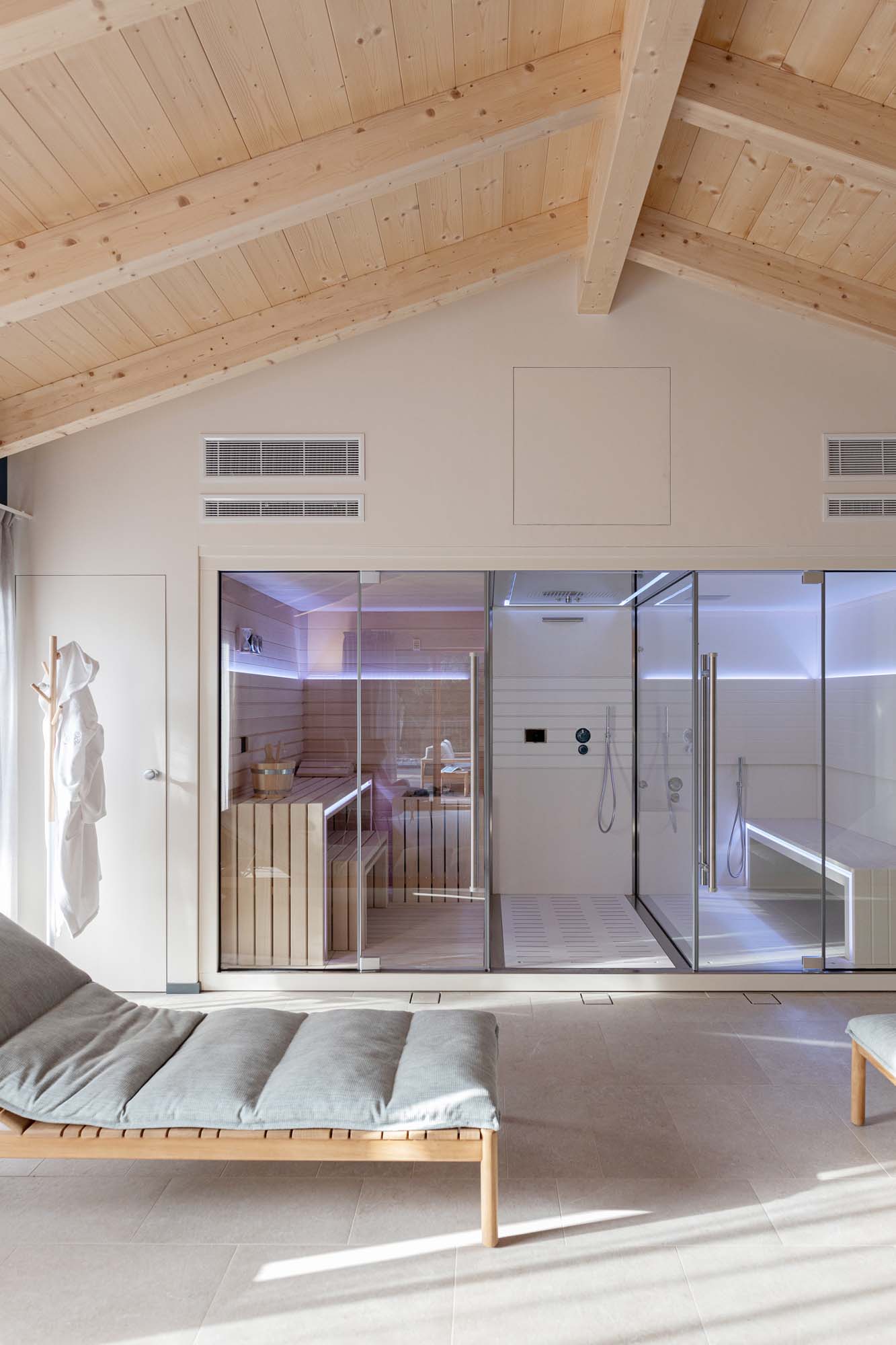 Particolare importanza è stata data alla zona spa, dove per i pavimenti e parte dei rivestimenti è stata utilizzata la linea Mystone Limestone Sand, un gres porcellanato dalla tonalità calda e naturale che regala atmosfere rilassanti e accoglienti, in perfetta sintonia con gli elementi naturali in cui i lodge sono immersi. La posa delle piastrelle in gres porcellanato, combinando formati diversi, crea un ritmo visivo dinamico e contemporaneo.