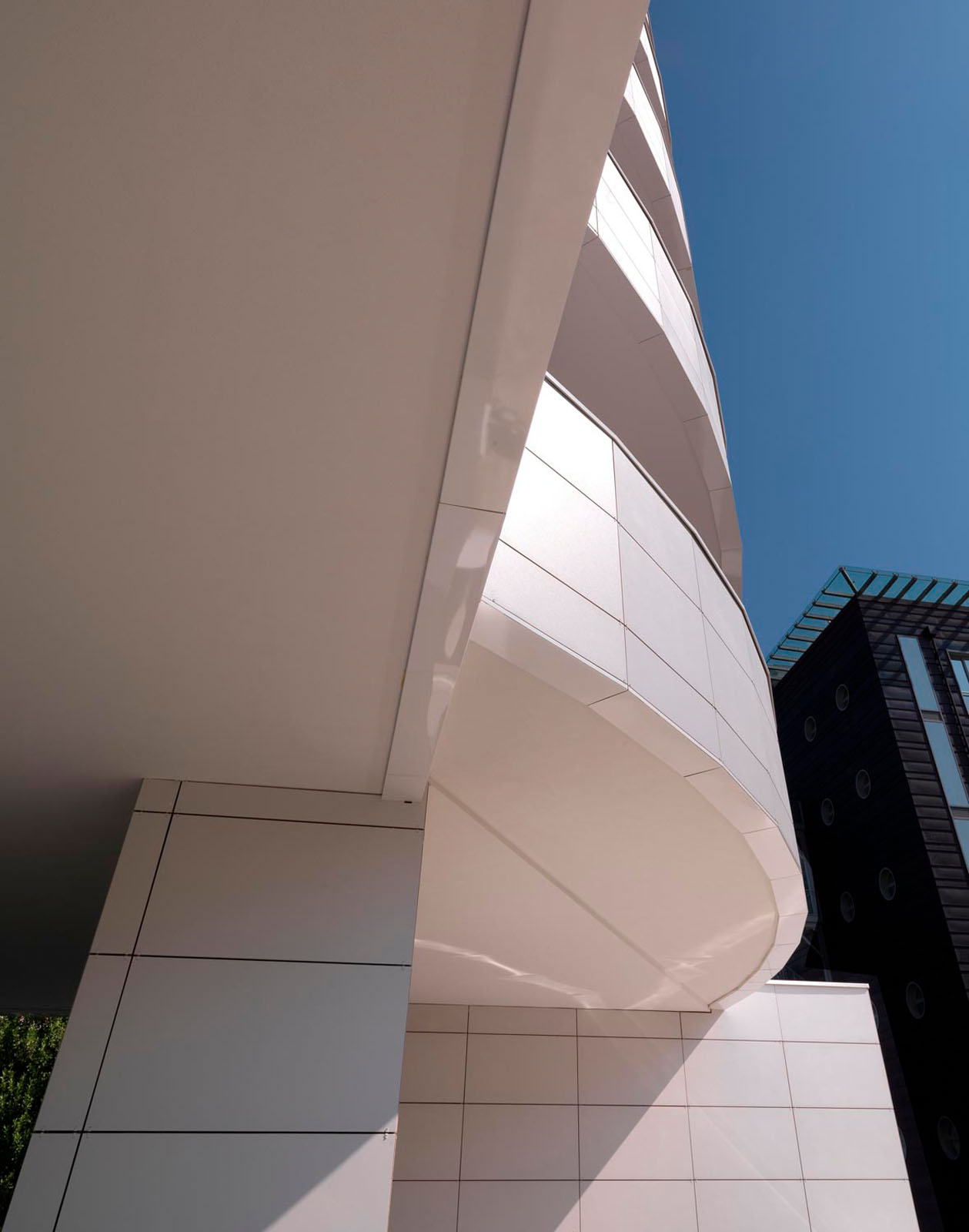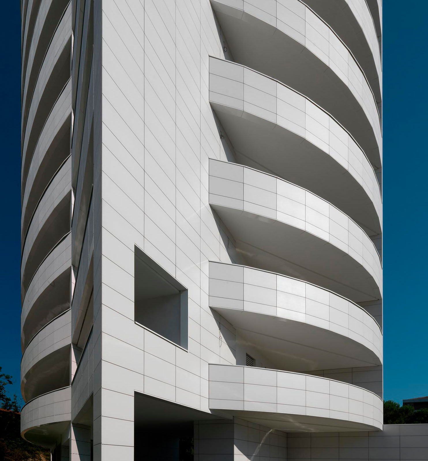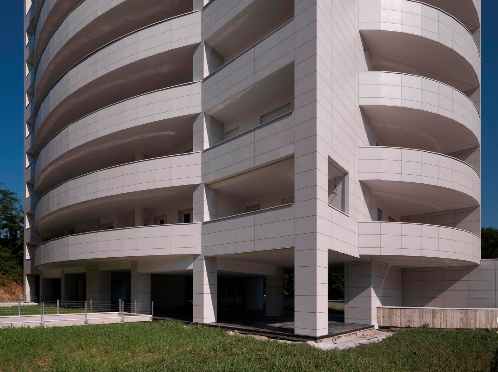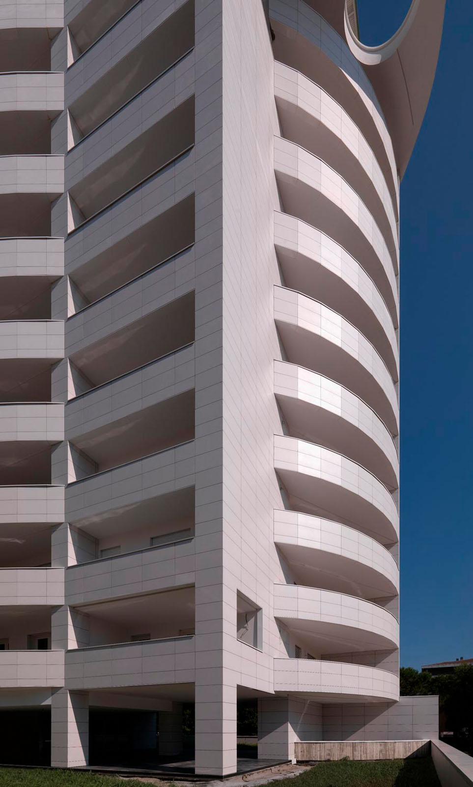 La cura dei dettagli è evidente nell’alto livello tecnologico delle dotazioni impiantistiche, nella ricercatezza dei materiali utilizzati, dalle finiture impeccabili. Il rispetto della natura e dell’ambiente circostante viene esaltato dall’innovativa scelta progettuale di applicare il rivestimento ceramico in gres con la tecnologia della facciata ventilata, progettata e fornita da Marazzi Engineering, ottenendo così una soluzione vincente in termini di risparmio energetico e di facilità di manutenzione. Ampie terrazze anch’esse rivestite e concepite con forme organiche, delineano il passaggio ed il naturale connubio tra gli ambienti interni e la natura circostante.