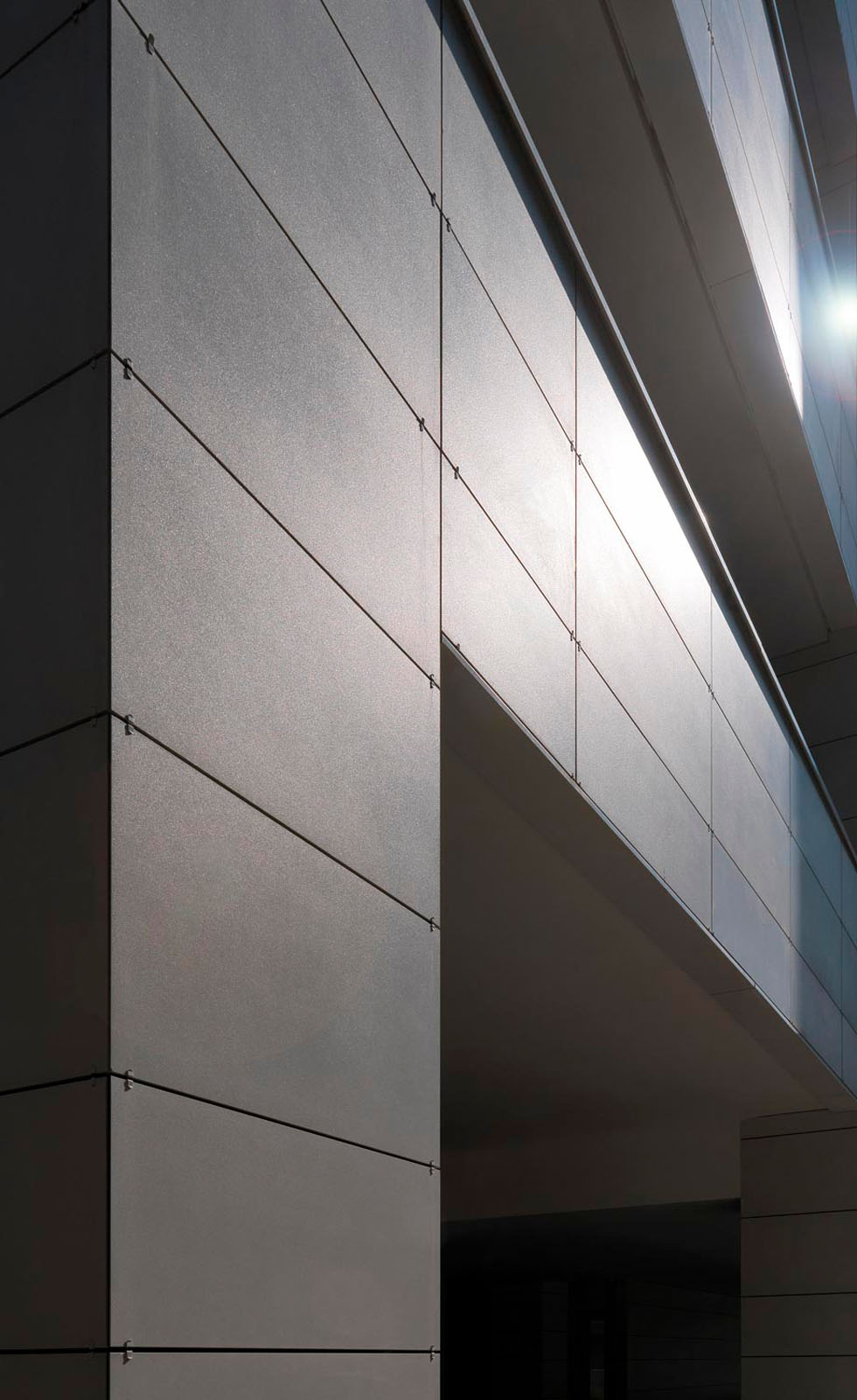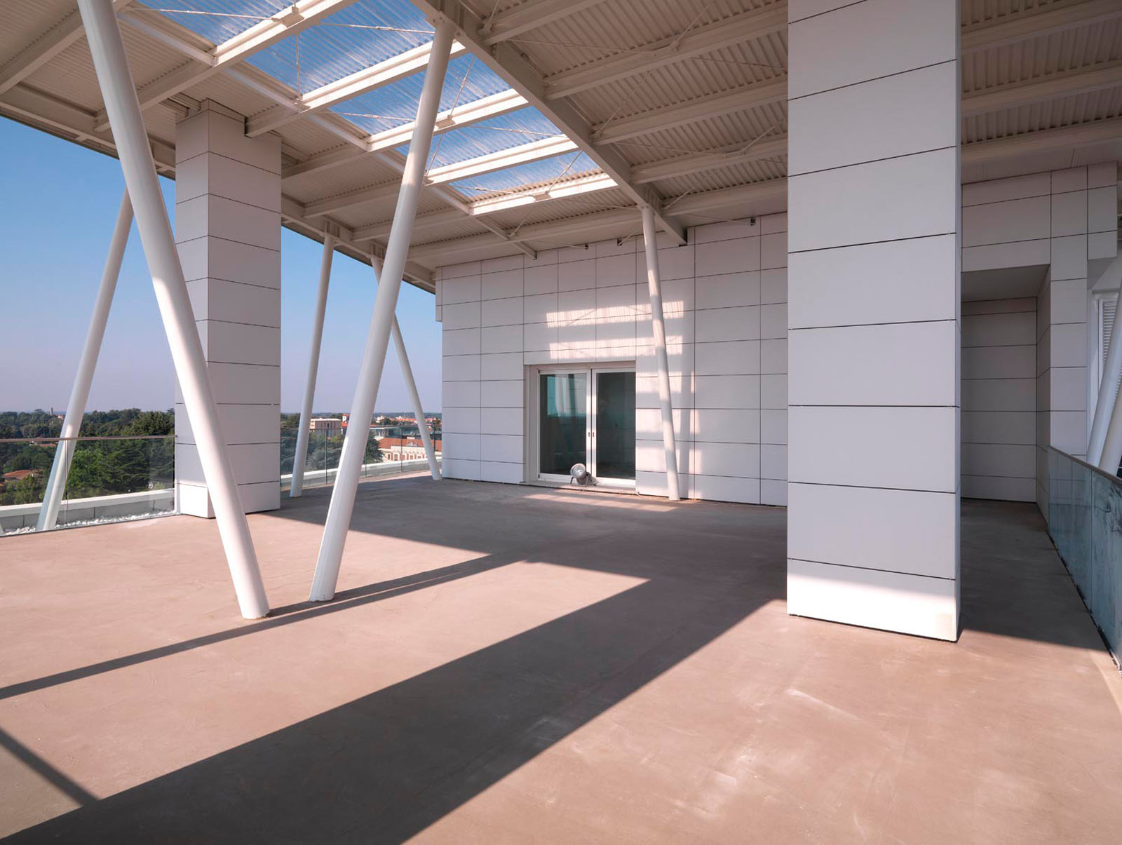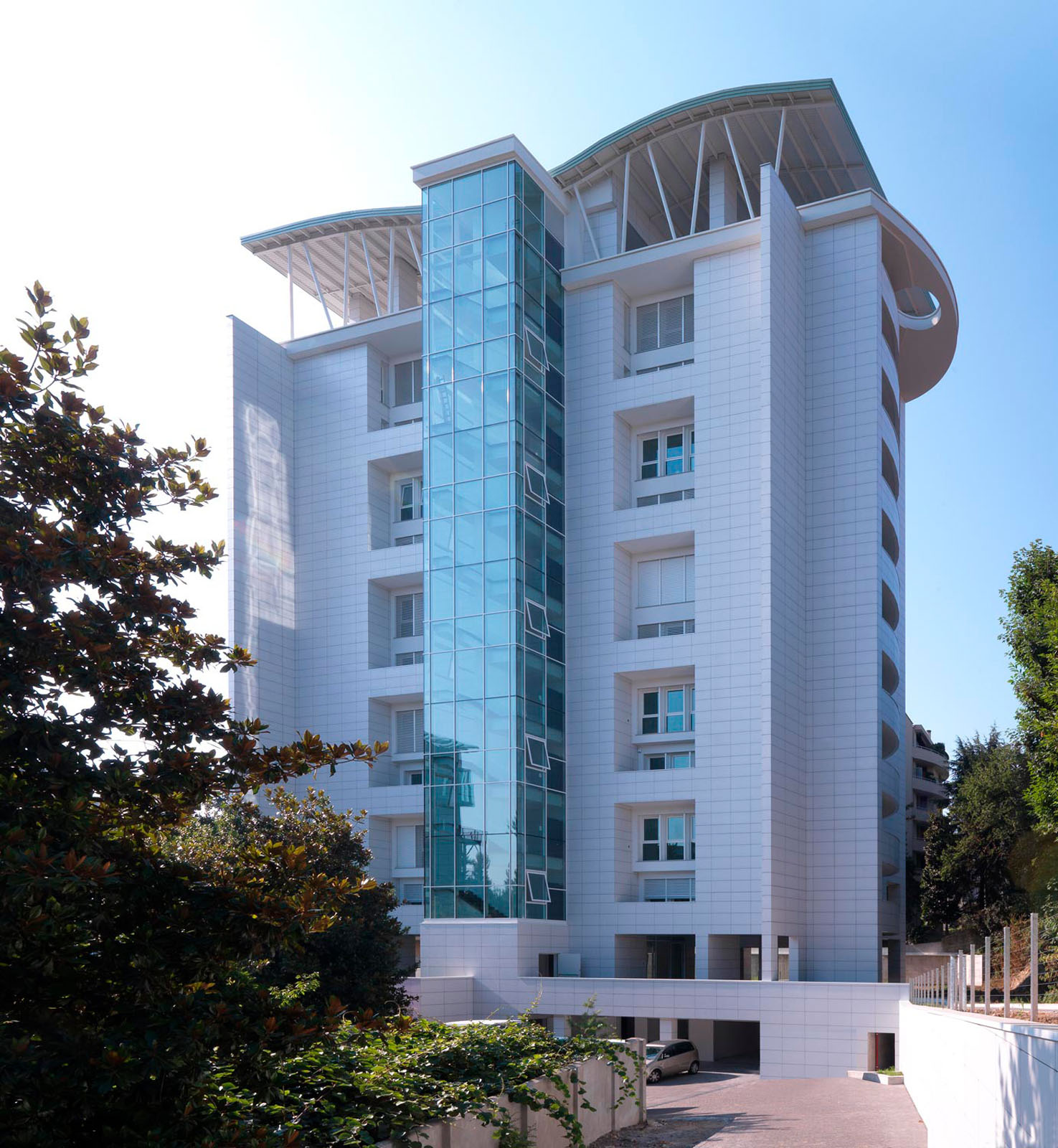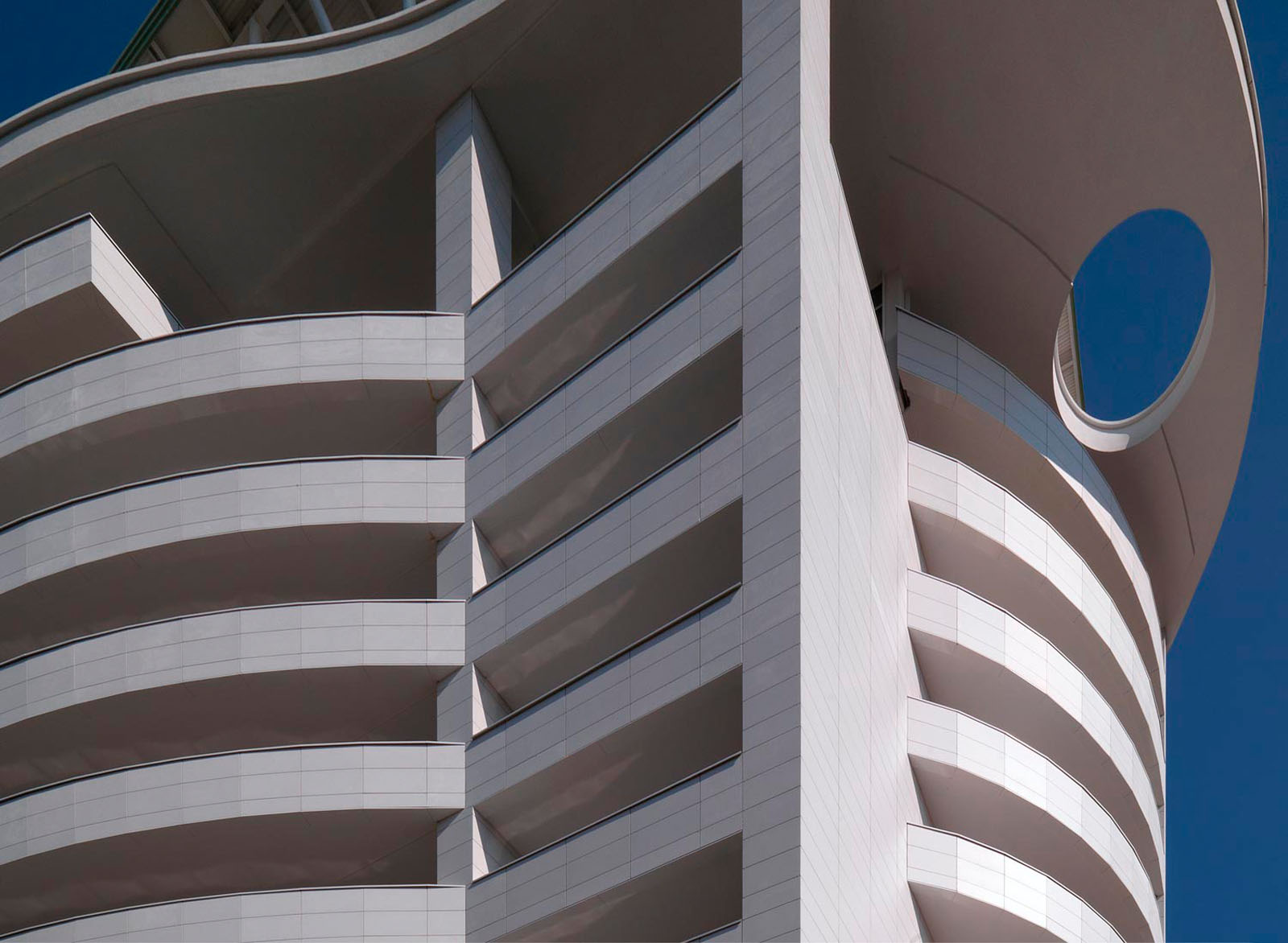 La cura dei dettagli è evidente nell’alto livello tecnologico delle dotazioni impiantistiche, nella ricercatezza dei materiali utilizzati, dalle finiture impeccabili. Il rispetto della natura e dell’ambiente circostante viene esaltato dall’innovativa scelta progettuale di applicare il rivestimento ceramico in gres con la tecnologia della facciata ventilata, progettata e fornita da Marazzi Engineering, ottenendo così una soluzione vincente in termini di risparmio energetico e di facilità di manutenzione. Ampie terrazze anch’esse rivestite e concepite con forme organiche, delineano il passaggio ed il naturale connubio tra gli ambienti interni e la natura circostante.