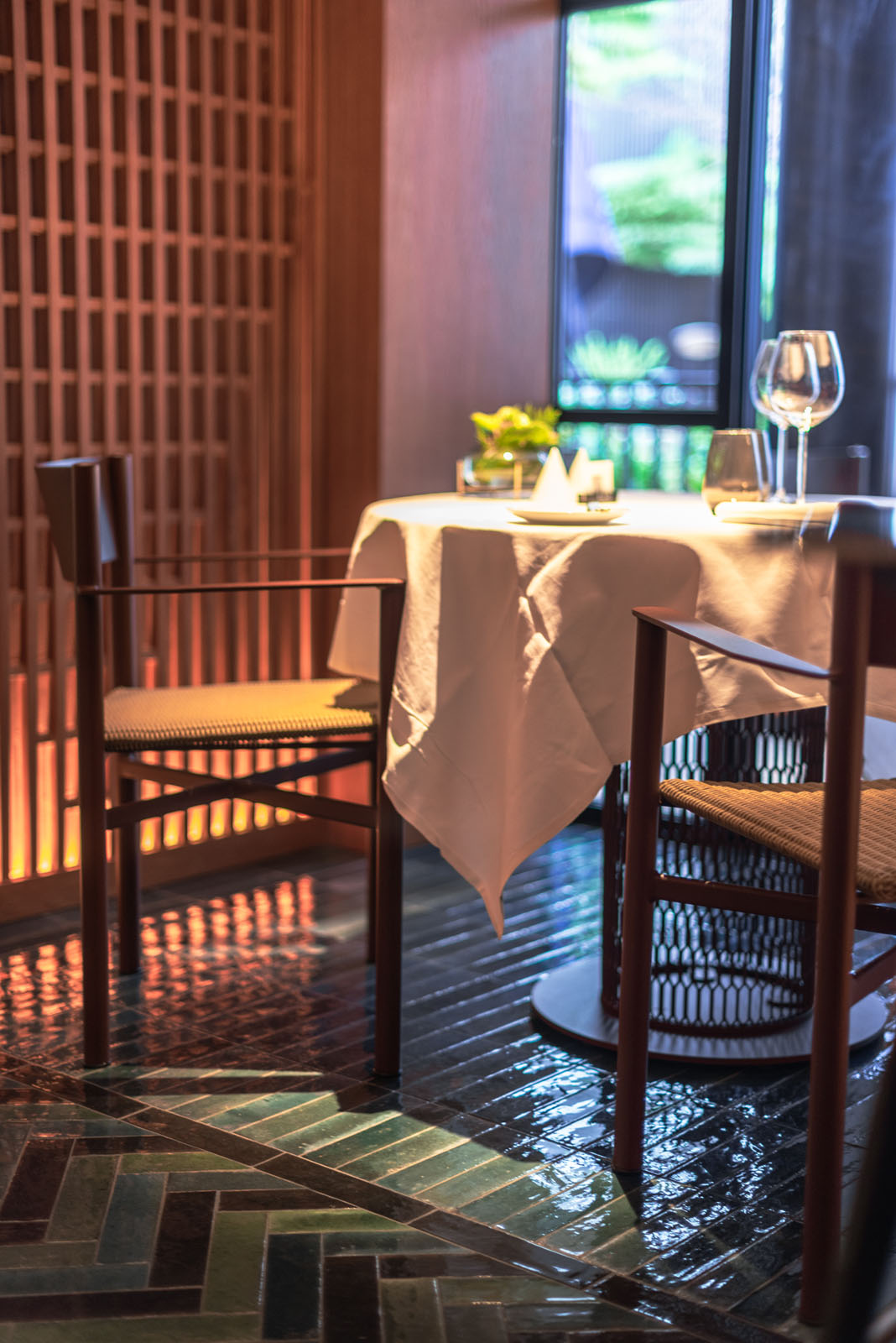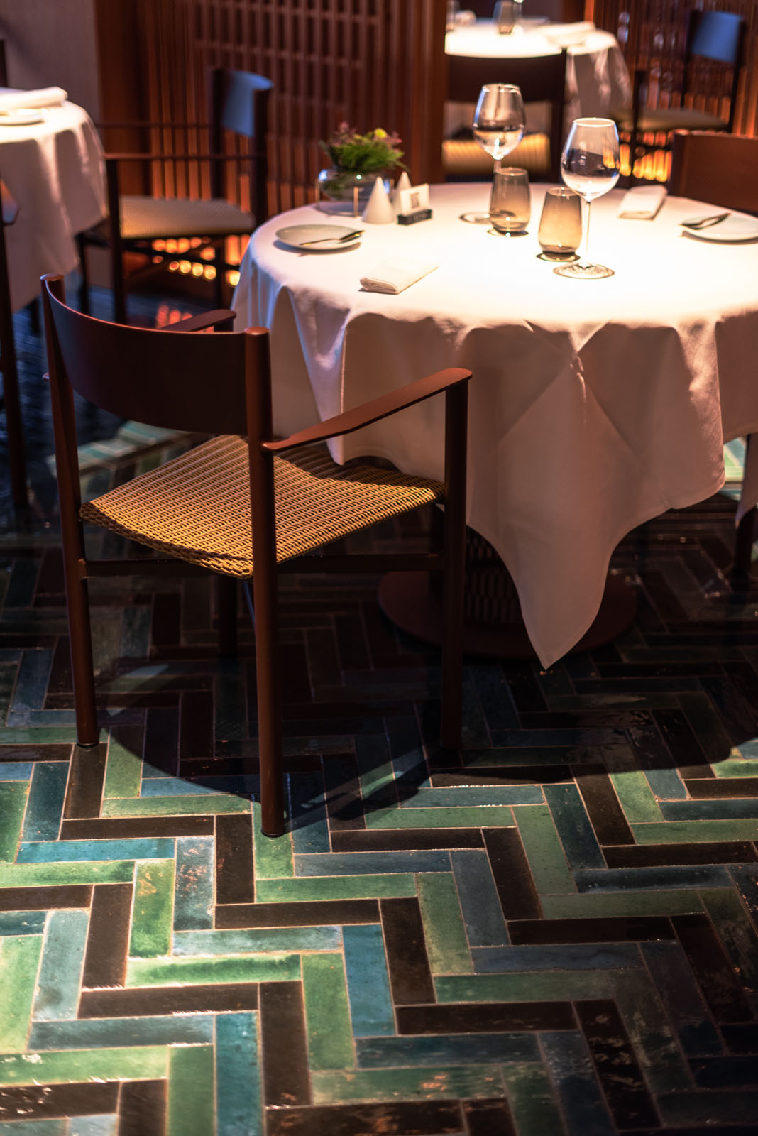 Entrando nella sala del ristorante a catturare l’attenzione è indubbiamente il pavimento, posato in una combinazione magistrale di colore e di luce. Le piastrelle di gres porcellanato Crogiolo Lume, nel formato 6x24 cm e posate a spina di pesce alternando i colori Green, Blue e Black, restituiscono l’immagine di un tessuto, creando con la loro superficie lucidissima vibrazioni di luce che rimbalzano sulla superficie volutamente imperfetta, ottenendo quella “situazione unica” voluta dallo studio Bastir.