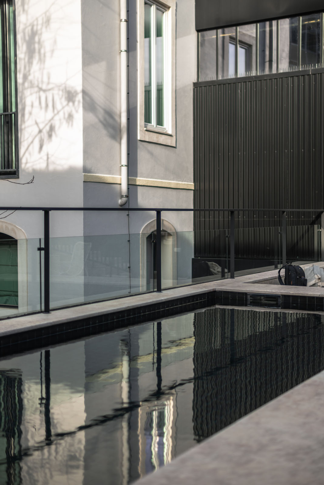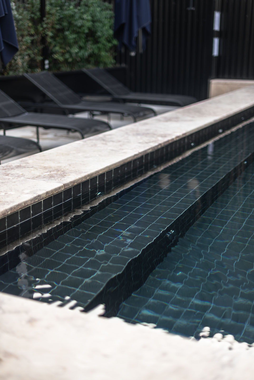 Nella zona della piscina riscaldata, in contrasto con le lastre chiare di limestone, la pietra locale, ritroviamo il piccolo formato in ceramica della collezione Crogiolo Zellige nella finitura Carbone Lux per il rivestimento delle pareti e del fondo vasca. Un colore inaspettato e suggestivo che suggerisce il colore profondo dei fondali atlantici.